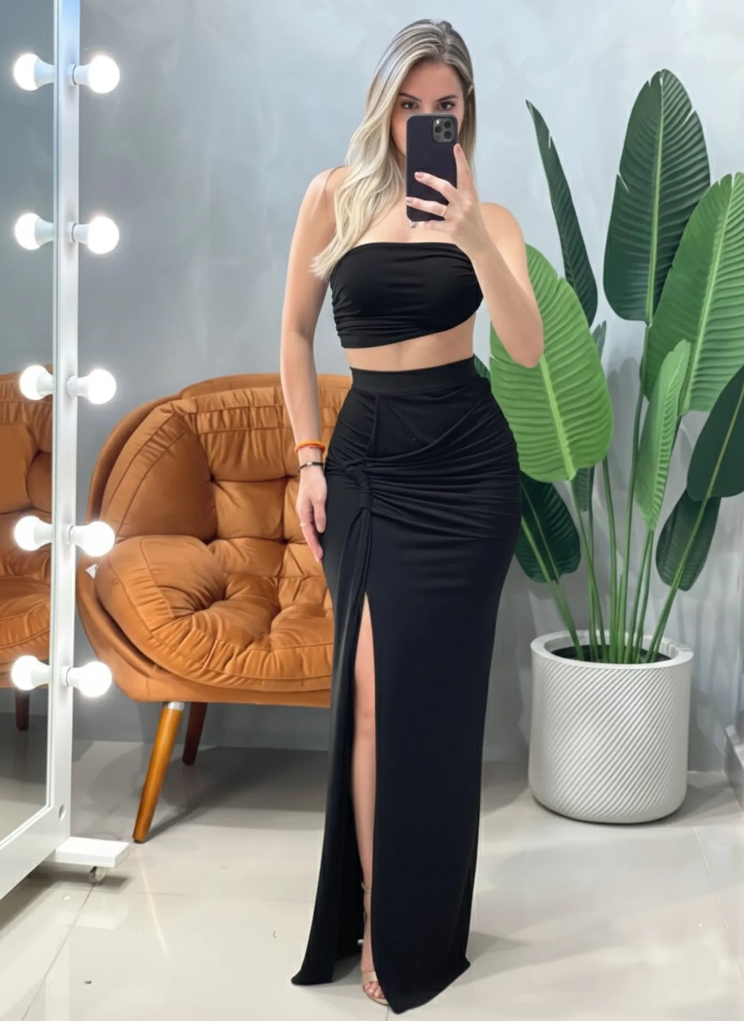 Conjunto em Poliamida Cropped Alça Única Franzido e Saia Longa Transpassada Ref. 1858